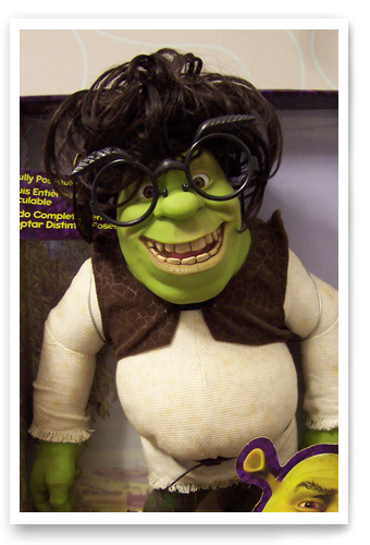 前些日子搬家的時候找到以前買的整人眼鏡,順手就這樣放在客廳坐鎮的史瑞克臉上,幾天後又將老婆的假髮卡卡口中救出,一時也不知道放哪就又順手的戴在史瑞克頭上,一切都只是偶然…卻天衣無縫。